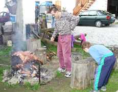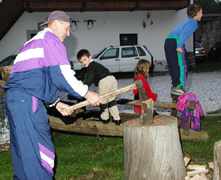 Pantáta Fanta připravuje dřevo na topení. | |  |