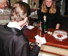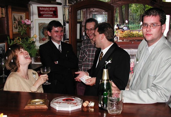 Pokus přesvědčit servírku, že když láhev Bohemky stojí 180,- Kč, tak celková útrata nemůže být 130,- Kč Počítala to celkem 3x a vždy jí to vyšlo stejně. Až po poradě s kolegou a mém usilovném naléhání to sečetla na 226,- Kč a 4,- Kč dostala na kurz matematiky. | |  |